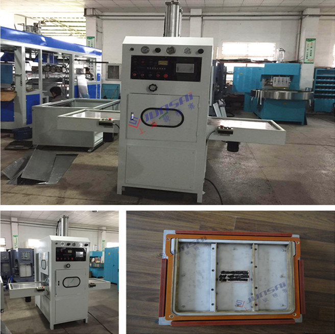 通過人工放料,高周波自動熱合壓邊切熔,定型,工作時通過人工放料,放入模具位置上,按起動開關,底部模具滑板自動滑動到固定工作位置,機頭氣缸驅動工模下降,通過預熱、高周熔接、切斷、定型,定型完畢機頭上升,底部工?;遄詣踊?,人工取出成品。在生產(chǎn)中可自由設置各部時間,一般為3--6秒一個作業(yè)過程。