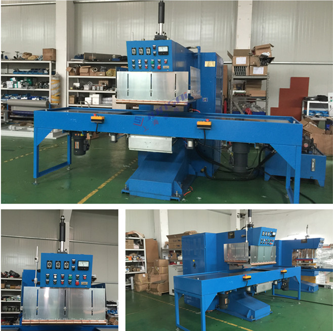 通過人工放料,高周波自動熱合壓邊切熔,定型,工作時通過人工放料,放入模具位置上,按起動開關,底部模具滑板自動滑動到固定工作位置,機頭氣缸驅動工模下降,通過延時預熱、高周熔接、切斷、定型,定型完畢機頭上升,底部工模滑板自動滑出,人工取出成品。在生產中可自由設置各部時間,一般為3--6秒一個作業(yè)過程。