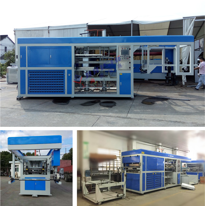 2.      將塑料片材加熱后,在成型站完成成型動作及產(chǎn)品定型,由鏈條將成型后的半成品輸送出來,再由自動沖切站完成送料、沖切和堆疊、計數(shù),并將設(shè)計數(shù)量的產(chǎn)品自動推到包裝平臺,邊角料自動卷曲成卷,完成產(chǎn)品的制作。